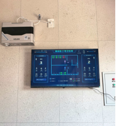1、進(jìn)入公廁我們就可以看到引導(dǎo)大屏,大屏上面顯示每個(gè)廁所的環(huán)境指數(shù),坑位占用情況,紅綠表示占用,綠色表示空閑,信息一目了然。